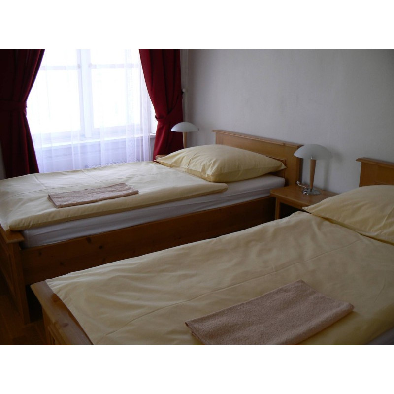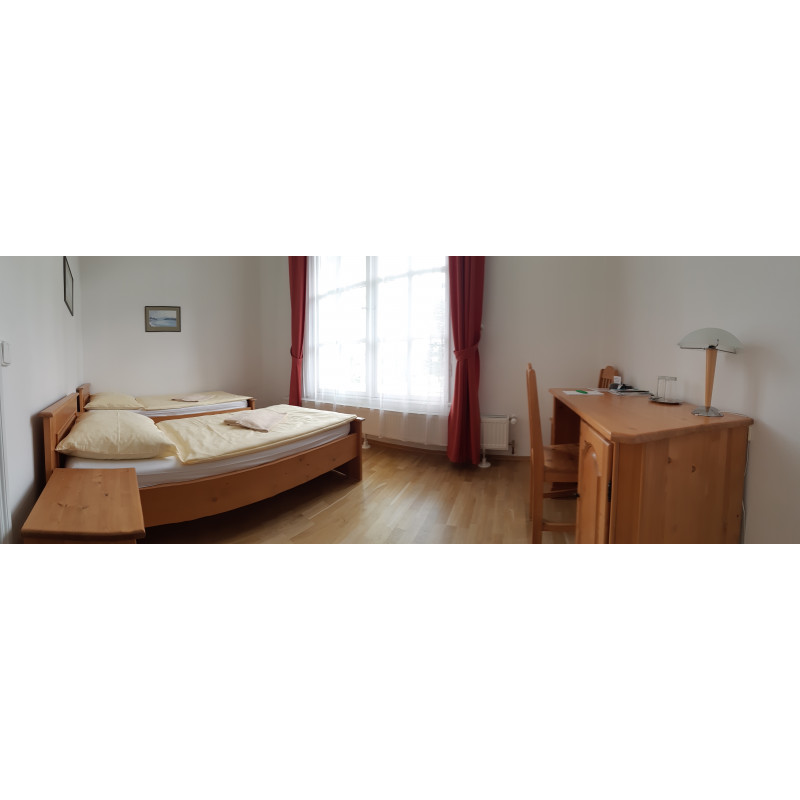 Nekuřácký pokoj vybaven v jednoduchém a vzdušném stylu  pohodlným a moderním nábytkem, pracovním stolem se židlemi, dostatkem úložných prostor, předsíňkou s botníkem a prostornou moderní koupelnou se sprchovým koutem a WC.