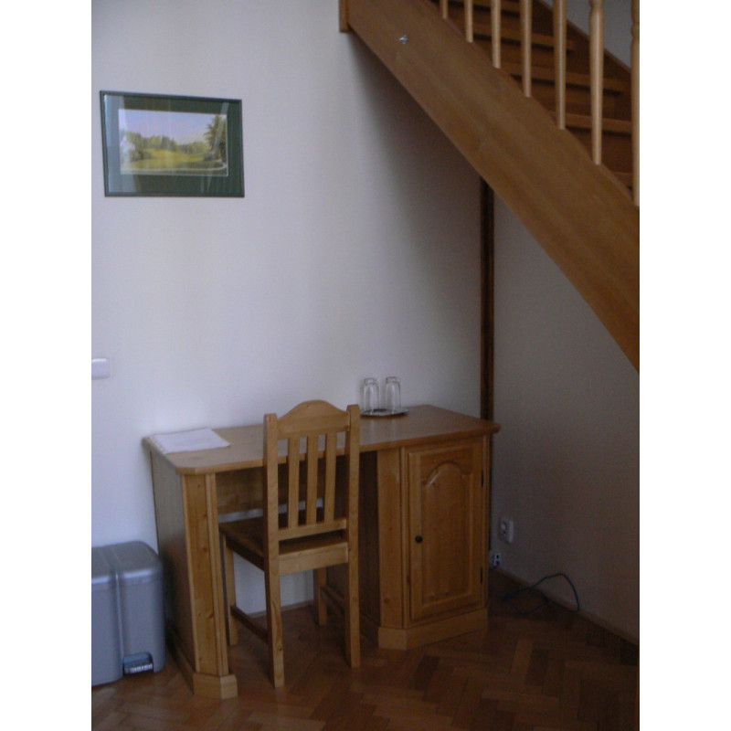Nekuřácký pokoj vybaven v jednoduchém a vzdušném stylu pohodlným a moderním nábytkem, pracovním stolem se židlemi, dostatkem úložných prostor a prostornou moderní koupelnou se sprchovým koutem a WC.