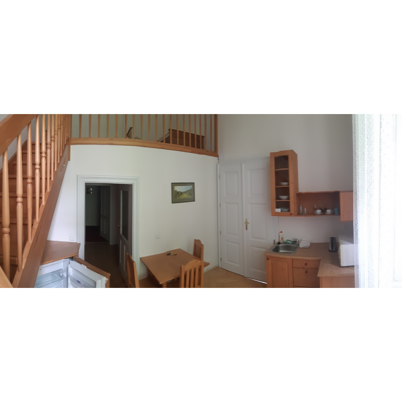 Pokoj se dvěma lůžky v patře, kuchyňským koutem s lednicí a velkou koupelnou (pro disable) se sprchovým koutem a WC.